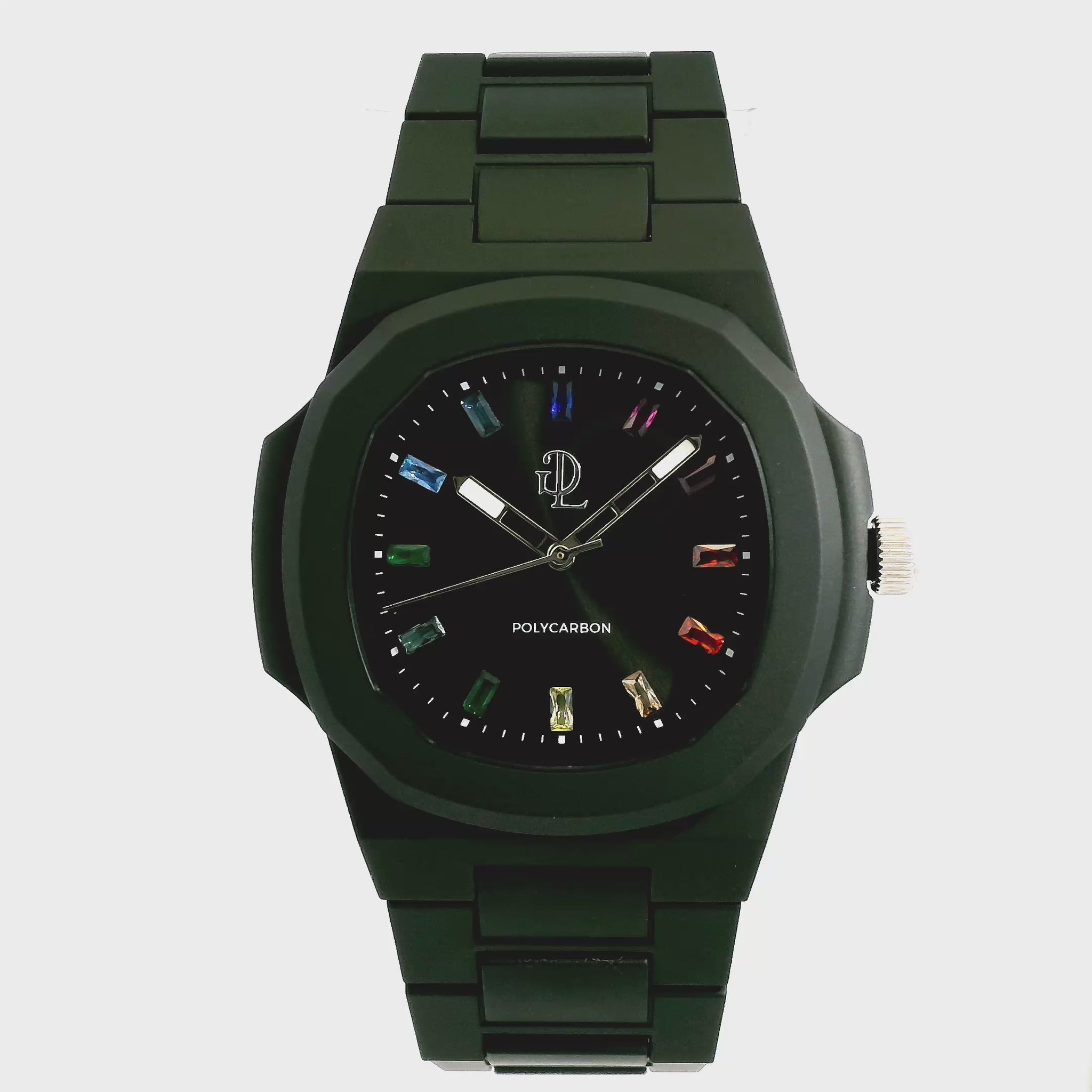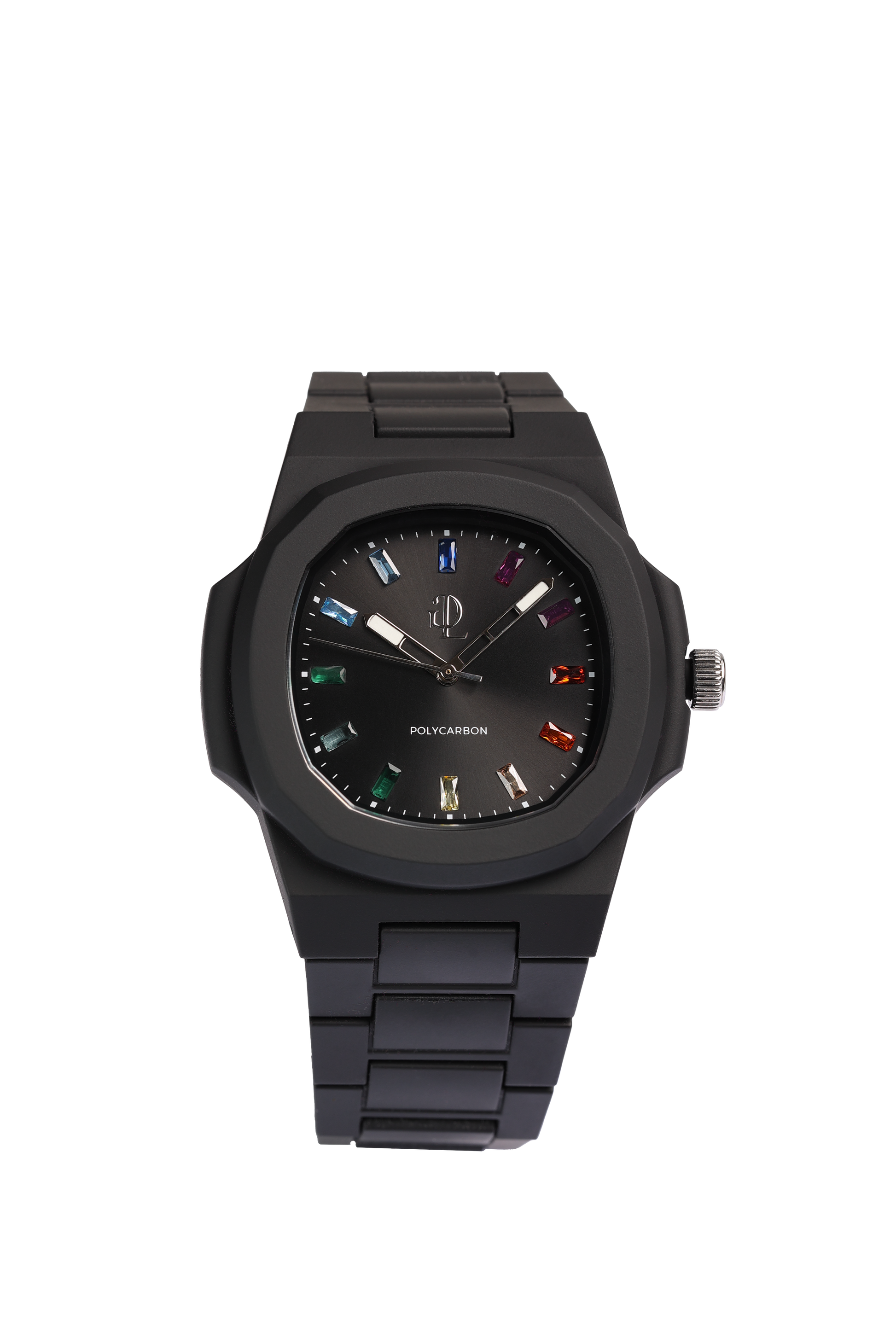 - ttenzione ai Dettagli: Il lunetta in policarbonato si integra perfettamente con il fondo cassa in acciaio inossidabile color Nero, elegantemente inciso per un tocco sofisticato. Il quadrante analogico presenta indici in Cristalli Colorati Taglio Baguette e dettagli in acciaio inossidabile, protetti da un cristallo minerale color argento con finitura anti-riflesso, garantendo durata e leggibilità in varie condizioni di illuminazione.